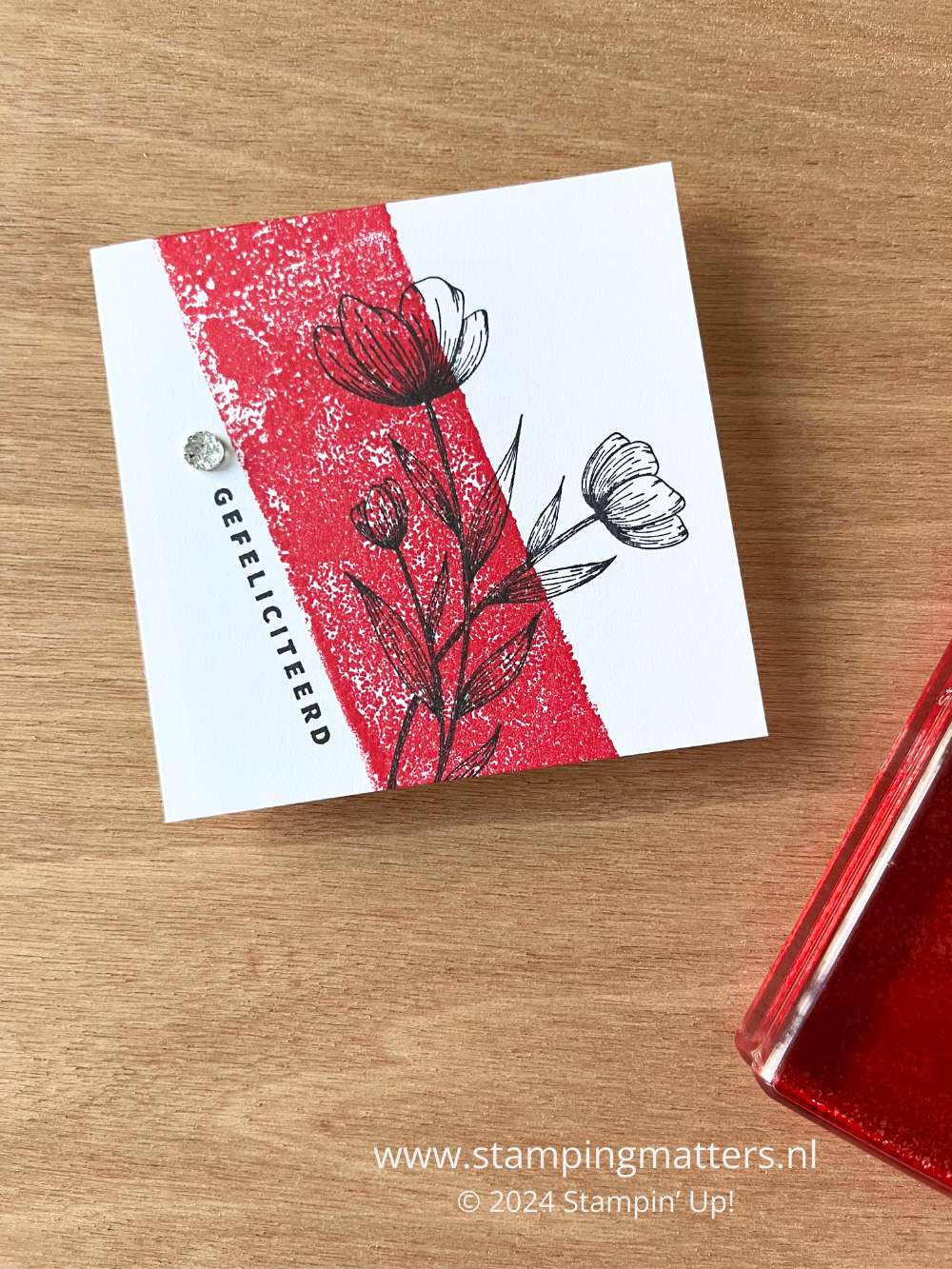 - Laat de afdruk drogen en stempel er daarna met Memento Tuxedo Black inkt een bloementak overheen uit de stempelset Spotlight on Nature.