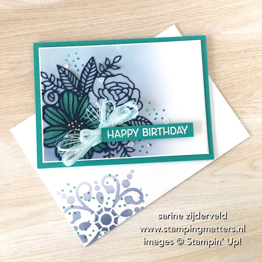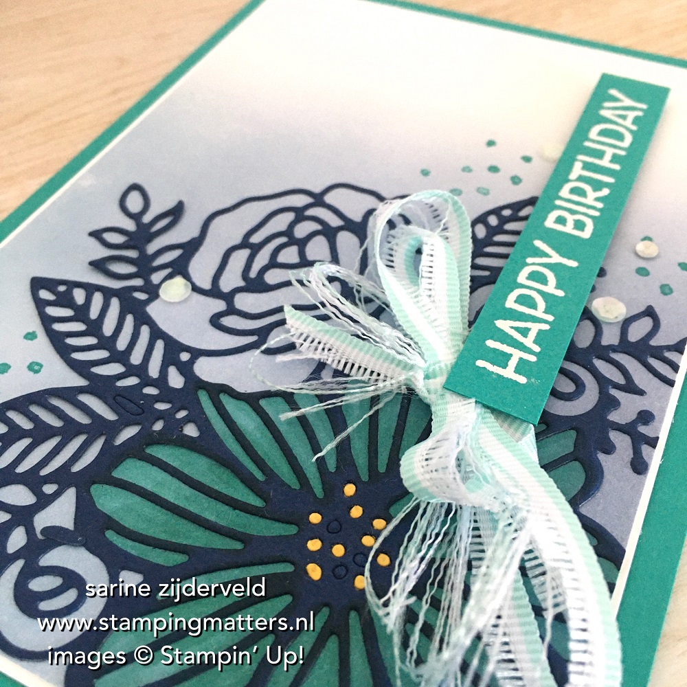 Dat je met dezelfde techniek natuurlijk ook kaarten kunt maken, zie je aan het voorbeeld van de verjaardagskaart. Hier heb ik de bloem uit de Uniek Artistiek stansen ingekleurd met Stampin’ Blends markers (Bermuday Bay):