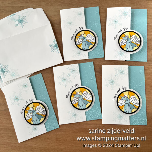 In de foto’s bij dit bericht zie je welke kaart ik bij dit thema heb bedacht. Ik gebruikte de techniek van gedeeltelijk stansen, in combinatie met de glas-in-lood-achtige stempelset So Very Merry.