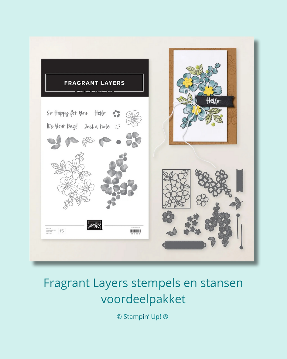Voor deze kaart gebruikte ik de Fragrant Layers stempels en stansen (op de combinatie geldt 10% korting, maar ze zijn ook los verkrijgbaar). Deze set zit in het Online Only aanbod dat tegelijk met de nieuwe voorjaarscatalogus van Stampin’ Up! is uitgekomen: