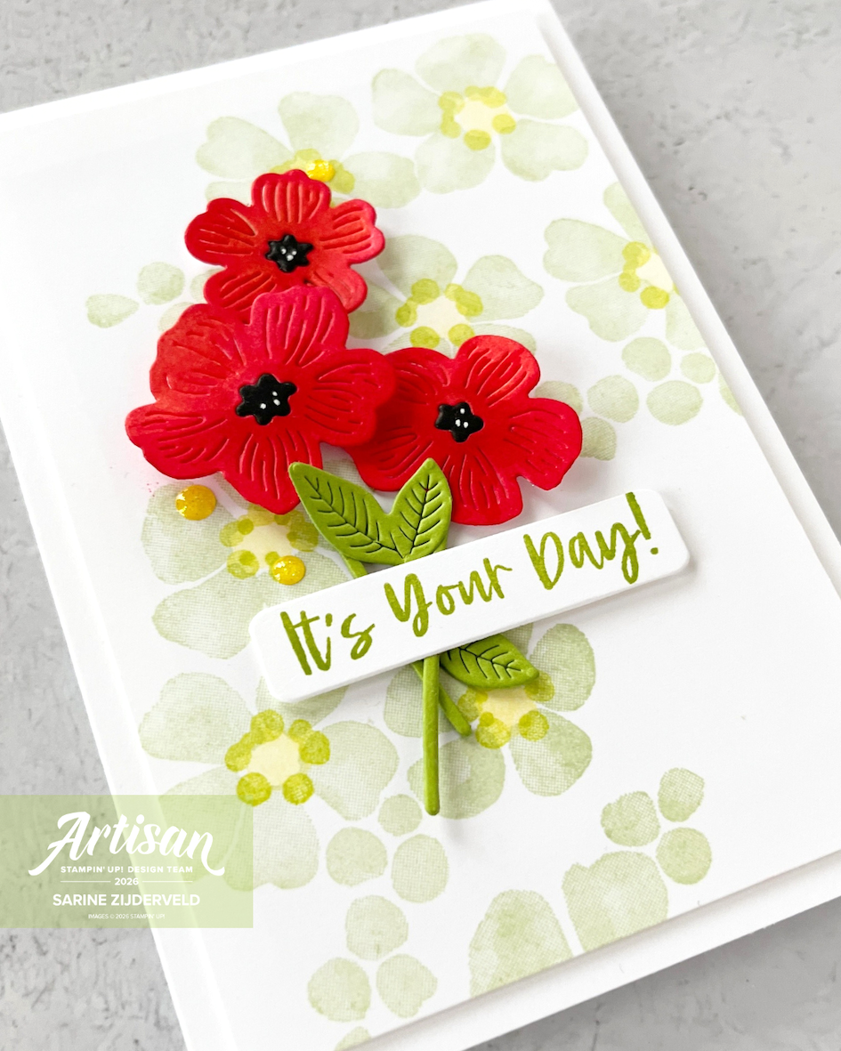 En stel je eens voor dat de achtergrond niet is gestempeld in het zachte Soft Sea Foam, maar in steviger Old Olive… welke kleur bloemen zou je dan op de voorgrond zetten?