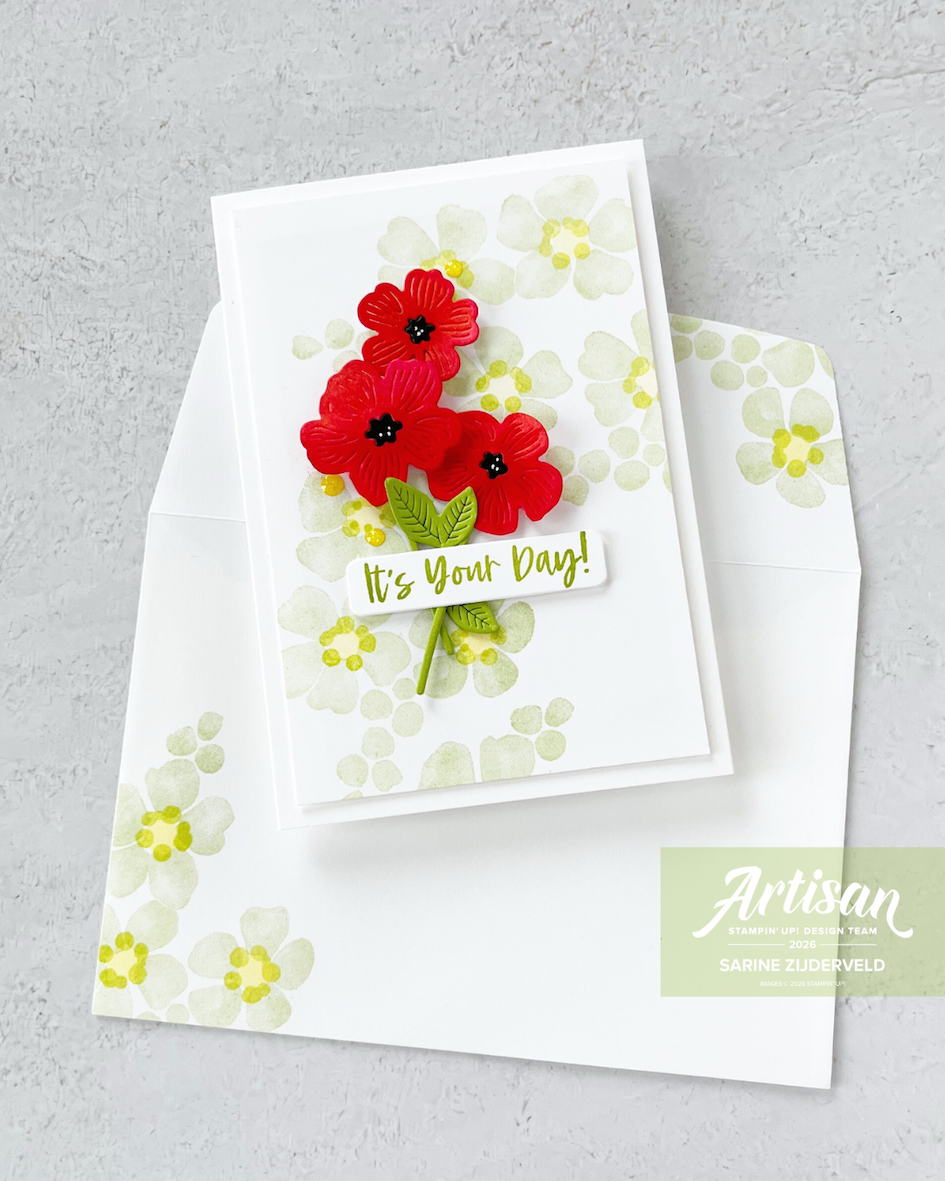 - Zet de derde (kleinste) bloem verhoogd met een dimensional op de kaart.